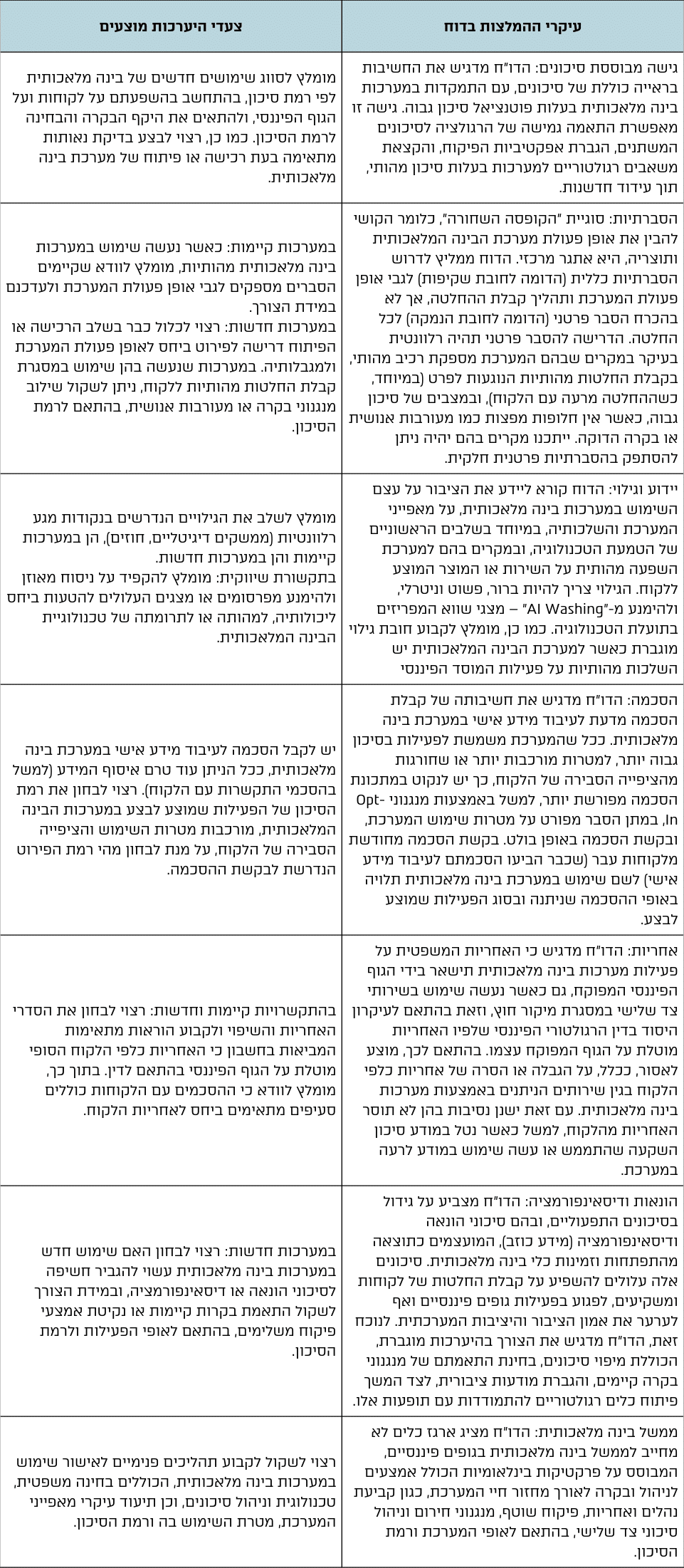 לצד יתרונות אלו, חדירת הבינה המלאכותית למגזר הפיננסי מעלה גם אתגרים מורכבים, ובהם הקושי בהבנת אופן פעולתן של מערכות מבוססות בינה מלאכותית, וכן החמרה אפשרית של סיכונים קיימים כגון אפליה או מניפולציה. הדו"ח מתמקד בהצגת עקרונות וכלים להתמודדות עם אתגרים אלה, במטרה לאפשר שילוב אחראי של בינה מלאכותית במערכת הפיננסית, תוך צמצום סיכונים ועידוד חדשנות. כמו כן, הדו"ח מציע עקרונות וכלים ליישום אחראי של בינה מלאכותית, שמטרתם לצמצם סיכונים ולחזק את הפיקוח והבקרה.